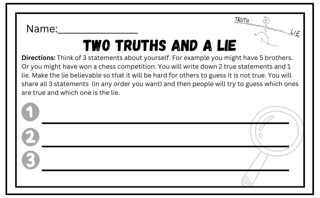 This classic game is a great way for students to learn more about each other and gives them an opportunity to share about themselves. All they have to do is think about 2 true statements about themselves and 1 lie. Then they share them with the class. Next the other students try to guess which one is true and which one is a lie. You can do this by calling on volunteers or by having students put up fingers to vote. 1 finger if they think the first statement is a lie, 2 fingers if they think the second statement is a lie, and 3 fingers if they think the third statement is a lie. If you want your students to write down their statements, we have a free worksheet!