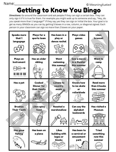 Get to Know You Bingo is a great way to get students up out of their seats and learning about each other. Students travel around the room asking each other questions about the squares on the Bingo Board looking to find people who can “sign” that the square is true for them.