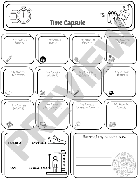 Time capsules are a great way for students to share more about themselves at the beginning of the year. After students complete them you can have them share them with a small group or do a whole class share. Then you can stash them away in a safe place and pull them out at the end of the year. You can even make it into a game where you pull out 1 sheet at a time and share clues about the mystery person and see if the class can guess whose sheet it is. Students love seeing how they have changed over the year. Is pink still their favorite color? Has their favorite book changed? Have they grown? Did their drawing skills improve?